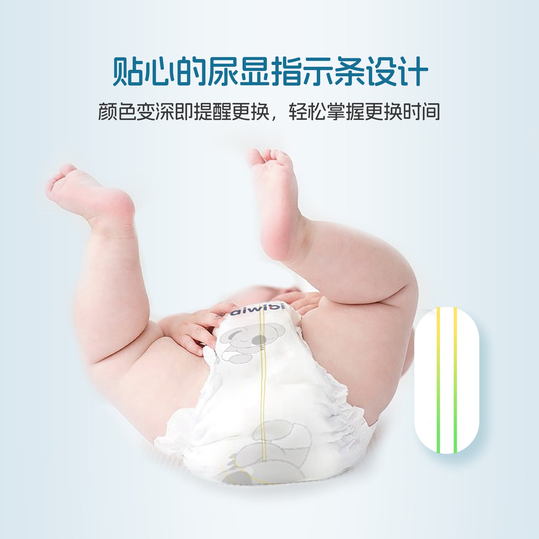 遇湿后从黄色变为绿色,变色提示清晰直观,轻松掌握换纸尿裤的时间。
