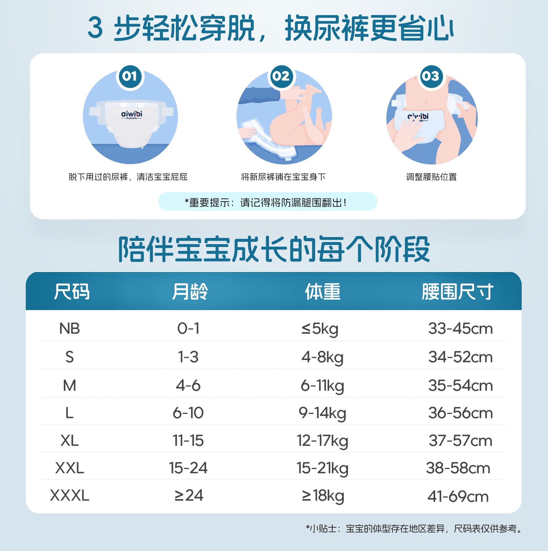 ③ 开封后请尽快使用,以保持纸尿裤的最佳使用状态。由于Aiwibi纸尿裤的超强吸收芯可能会吸收空气中的湿气,长期暴露于潮湿环境中可能会影响纸尿裤的吸收性能。