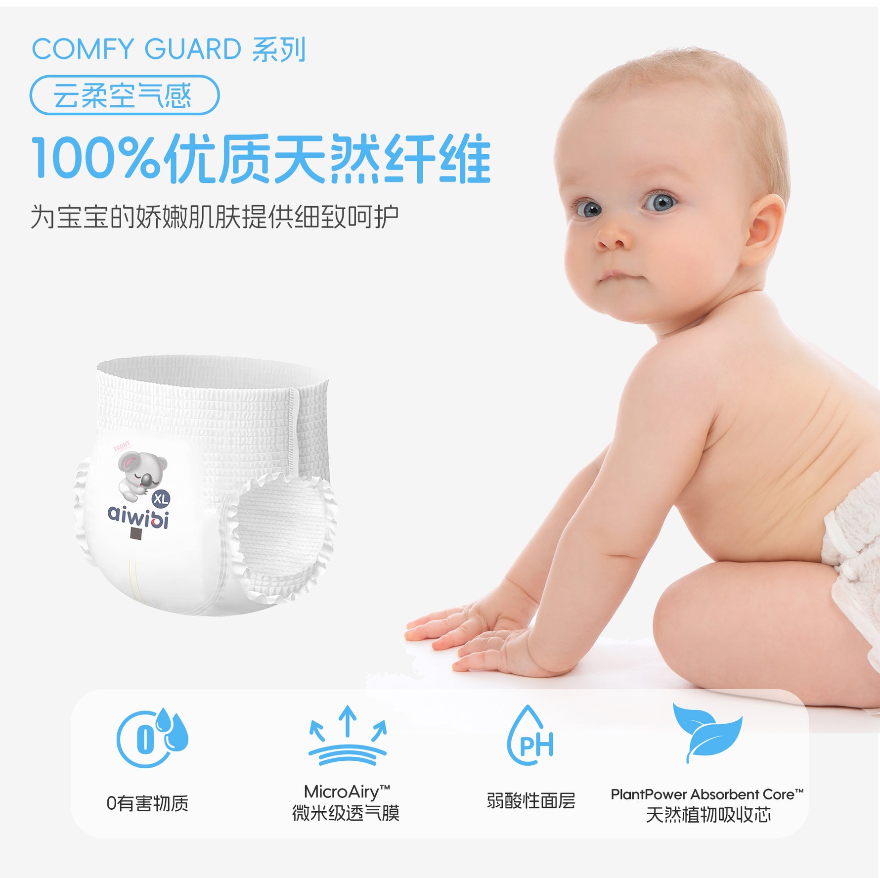 采用 100% 优质天然纤维,贴心呵护宝宝娇嫩肌肤,降低反渗率,减少肌肤不适。