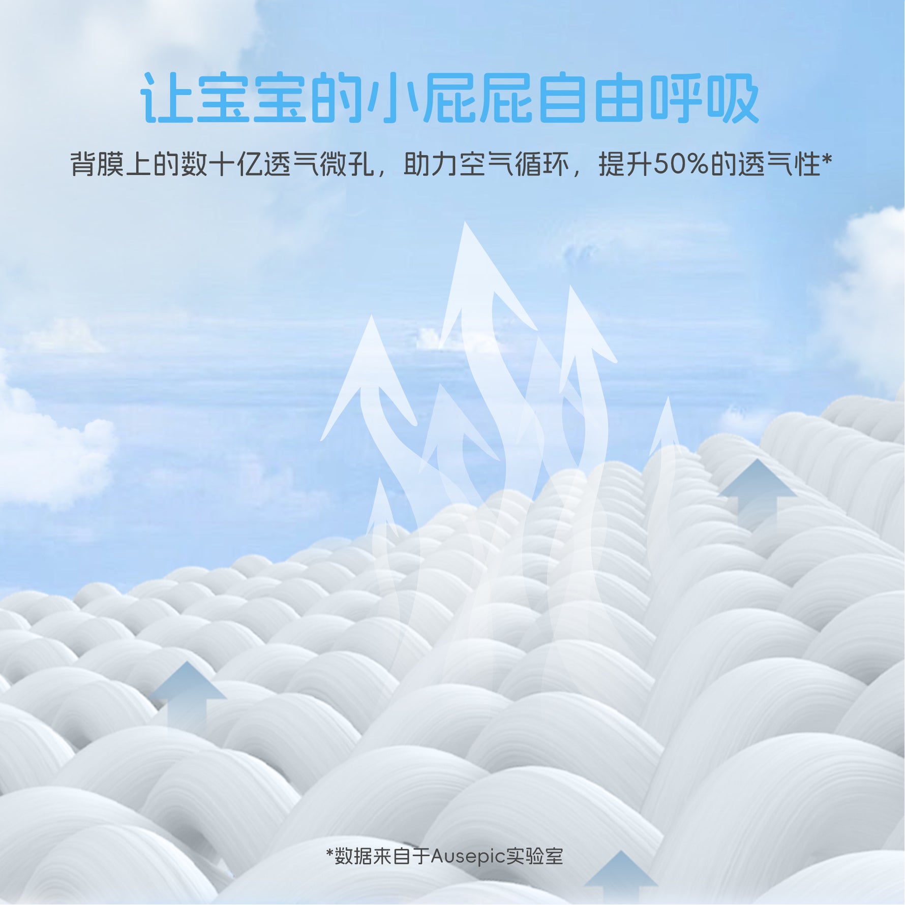专属 MicroAiry Film™技术,膜身布满数十亿超细微孔,既能让空气自由流通,又能阻隔水分,尿裤透气性提升 50%,时刻保持小屁屁干爽。