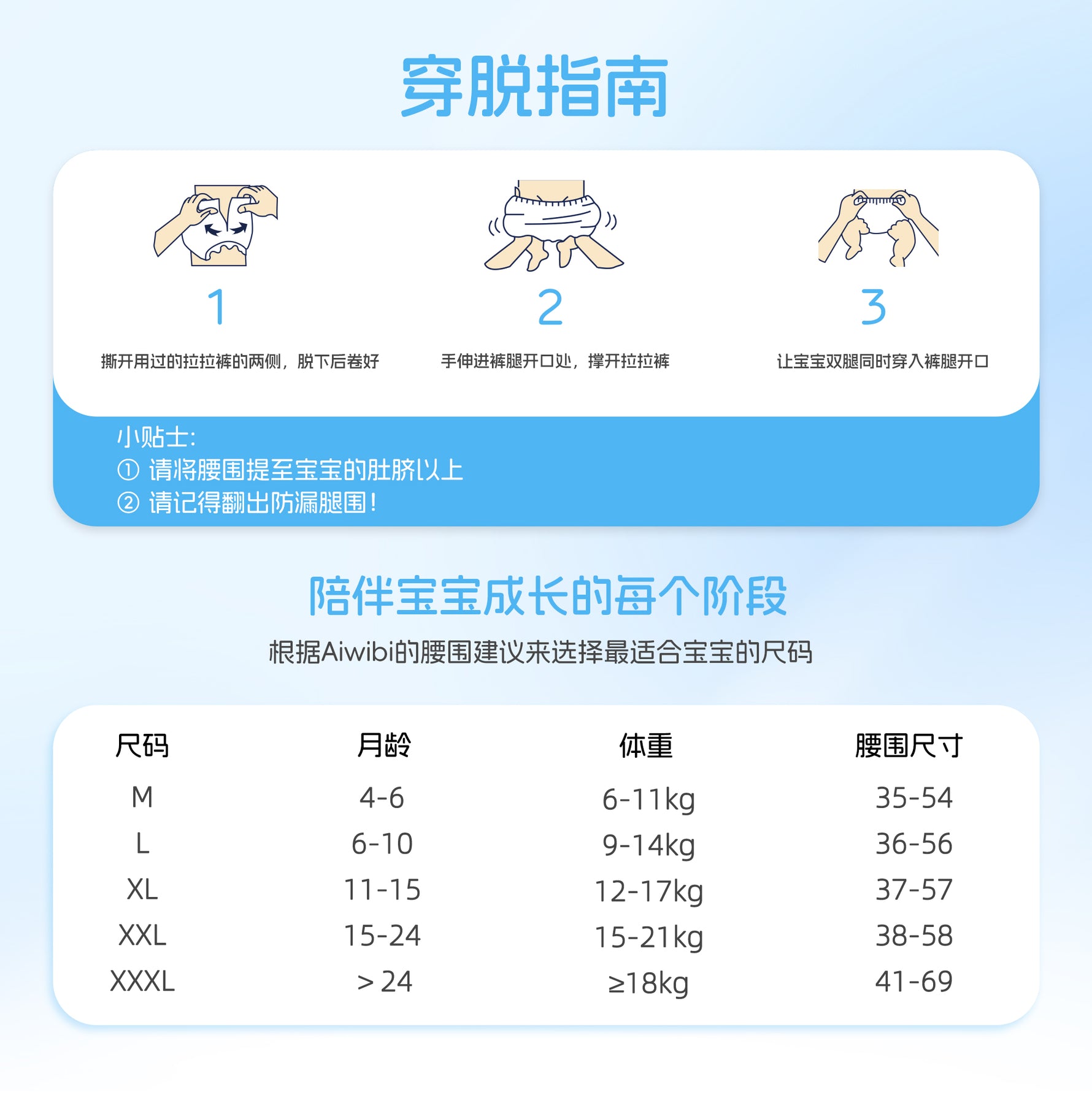 包装上的体重范围仅作参考,要根据宝宝的实际情况选择合适的尺码。例如,当尿裤贴合宝宝大腿,但裆部存在缝隙时,尿液就无法被及时吸收,就可能出现漏尿,这种情况就说明纸尿裤尺码偏大,需要及时更换更适合的尺码。